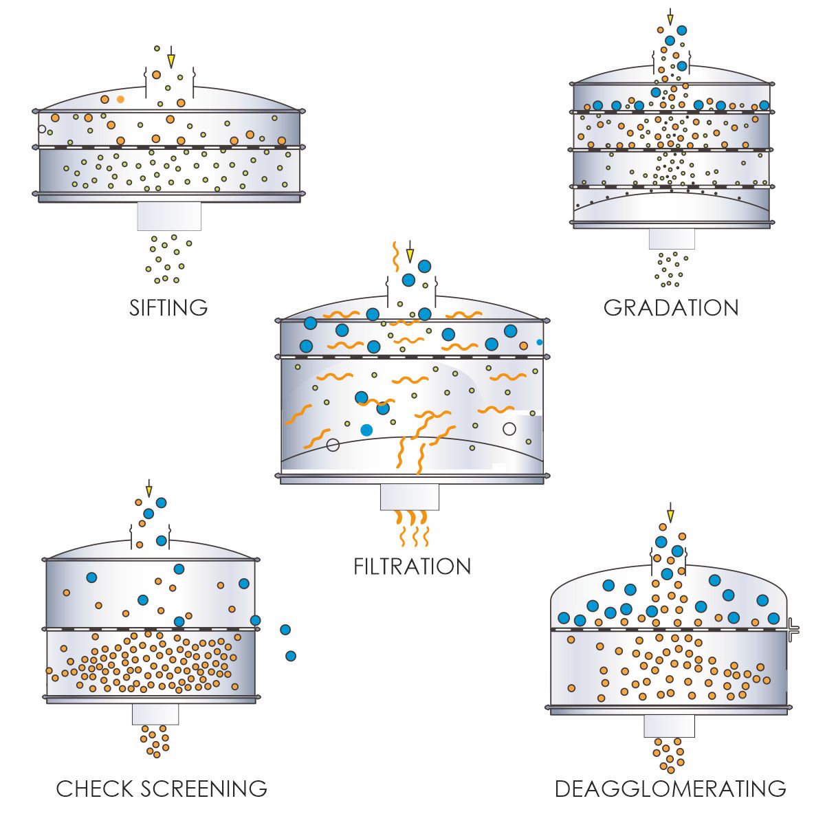 When we talk about capabilities of sieving machines so it can serve various kinds of applications which includes check screening, sorting, filtration, grading and deagglomeration. Our machines effectively separate particles by size and grade the material in 6 different sizes at the same time, with the help of check screening it ensures the product quality. It also helps to break down the material and agglomerates it, and if the material is in liquid form so it can work in that too. These kinds of machines are used in number of industries like food, pharmaceuticals, minerals, metal, ceramics and many more..